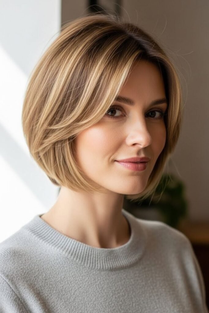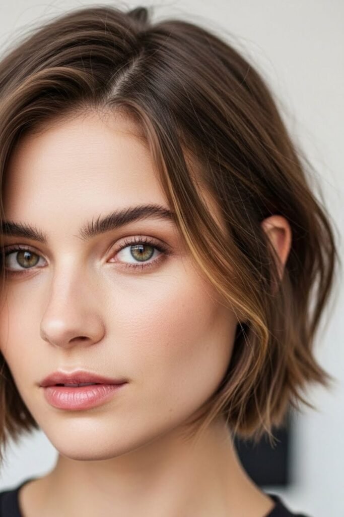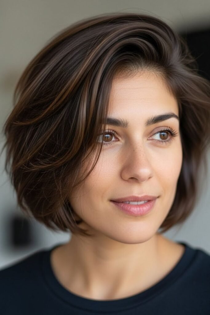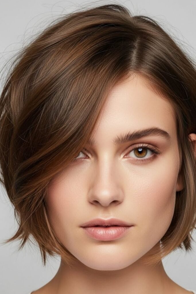 A high or expressive forehead doesn’t need hiding, just balance. This cut uses angled front pieces.