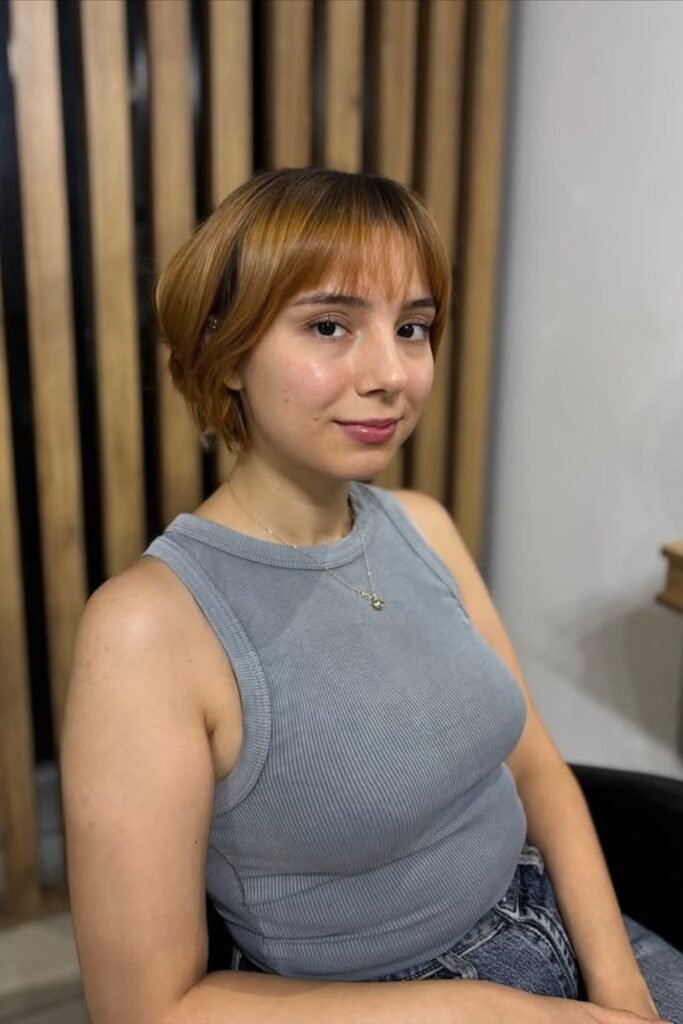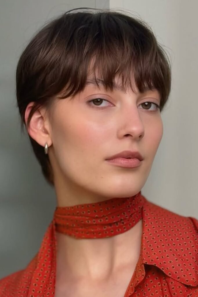 Softness takes the lead here instead of sharp edges. The short, light fringe brings attention to the eyes without closing off the face.
