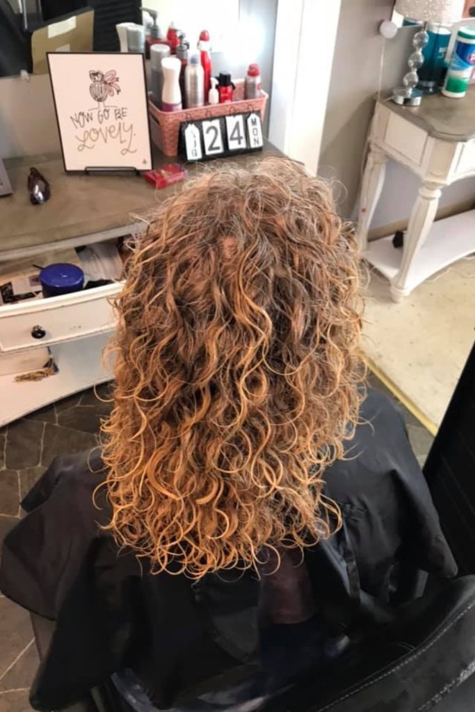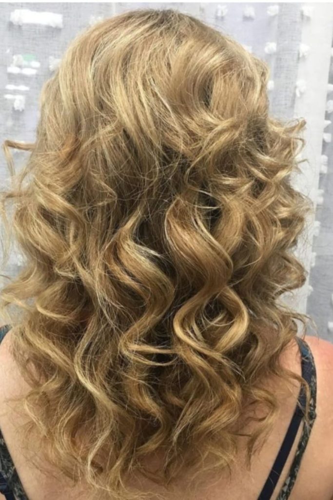 Your new look features soft, golden curls that give off a sun-kissed glow. With spirals that are defined yet loose, your hair will look full and voluminous.