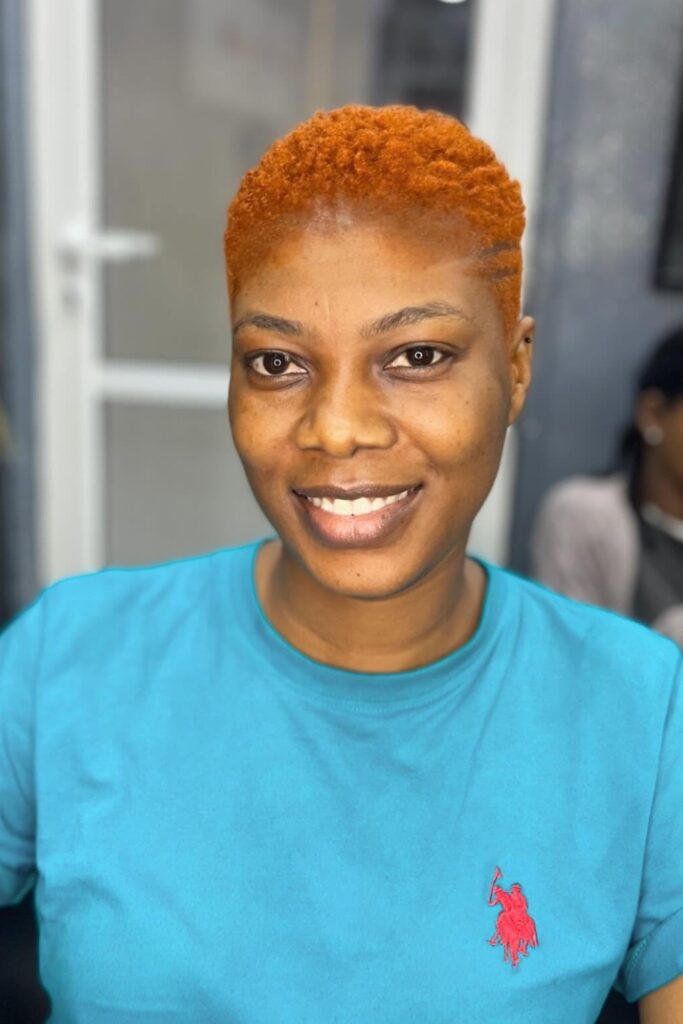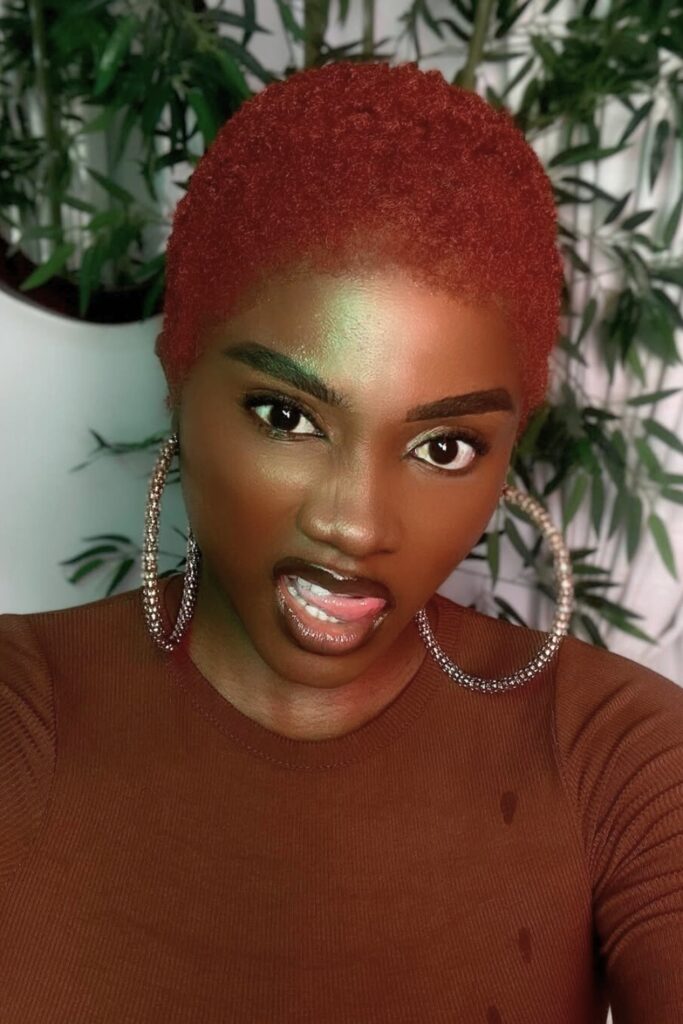 This rich color enhances the natural texture of the short, curled hair, offering a dynamic contrast that is both eye-catching and stylish.