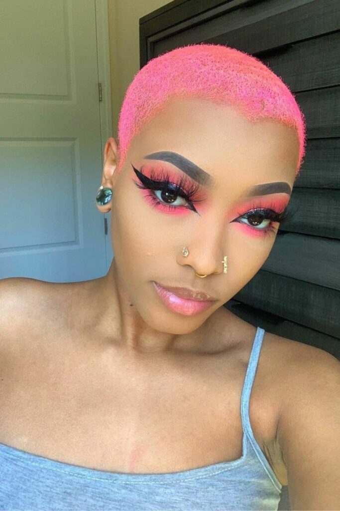 Embrace a bold and vibrant look with this eye-catching pink buzz cut.