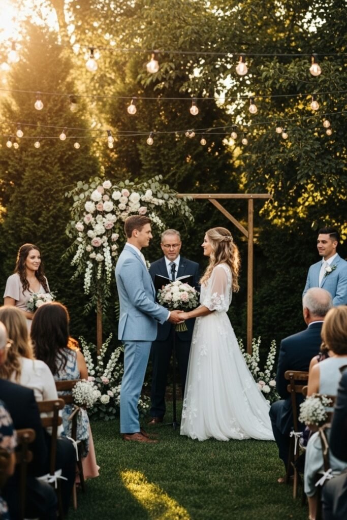 Set it up by choosing a simple focal point, adding string lights, keeping guests close, and focusing on vows rather than production.
