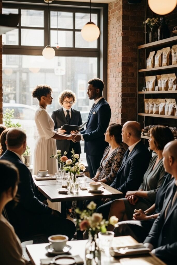 If cozy mornings inspire you, a café ceremony feels intimate, relaxed, and charming, with coffee aromas setting an unexpectedly romantic mood.