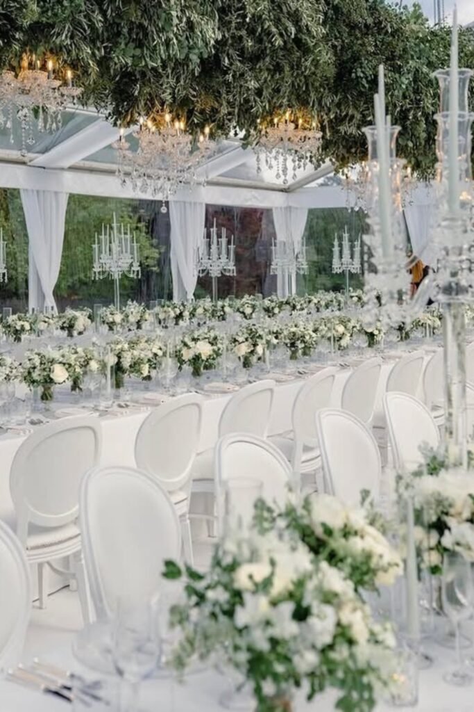 Glass chairs and candles add shine while keeping everything visually light and refined for elegant ceremonies indoors and outdoors.