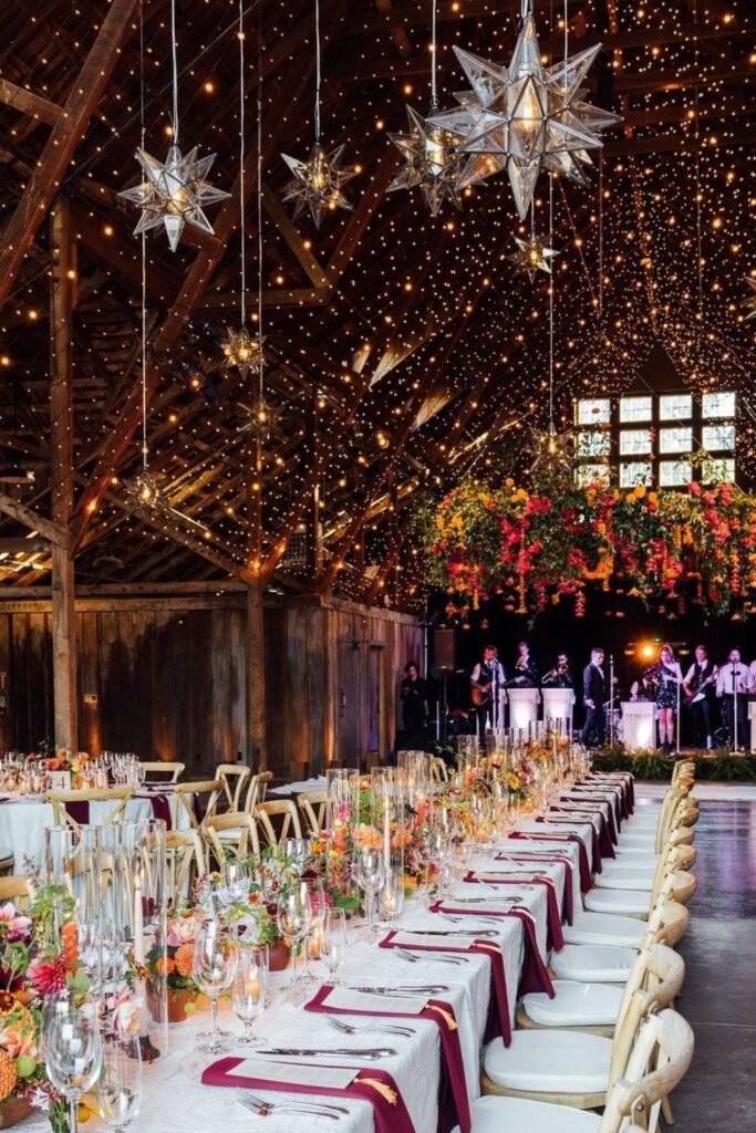 If you love dramatic evenings, layered string lights and star pendants instantly turn a rustic barn into something cinematic and unforgettable.