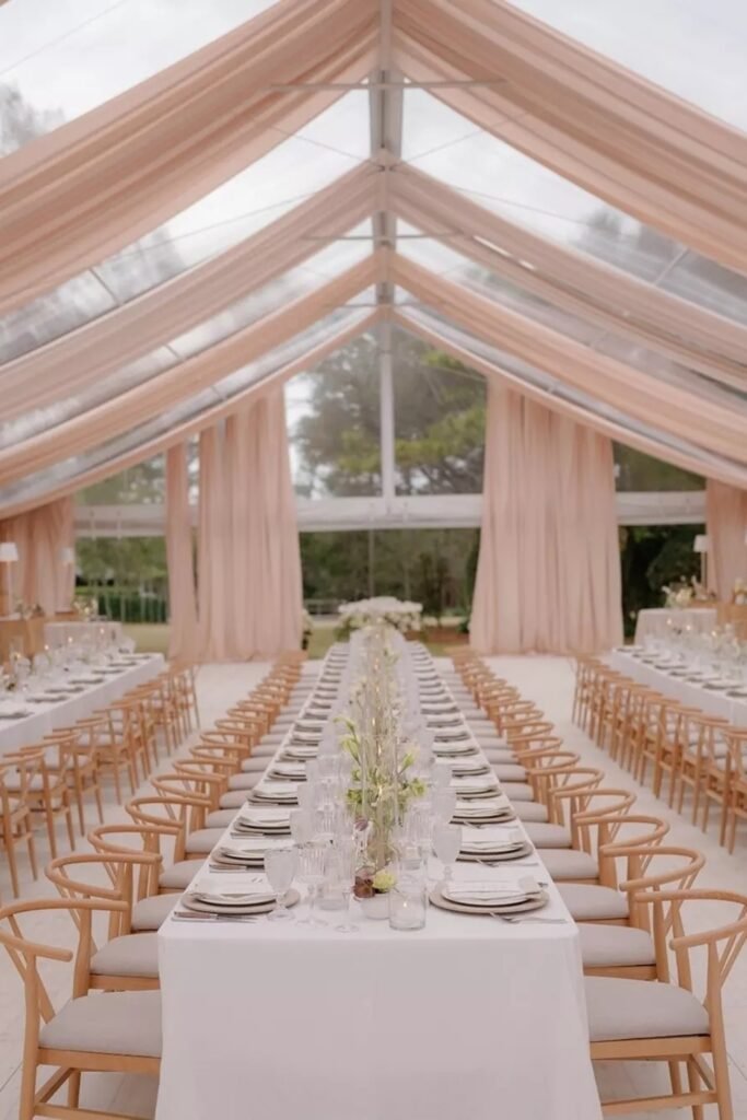 Soft blush draping under a clear tent instantly warms outdoor receptions, letting daylight glow softly while still feeling polished and intentionally styled.