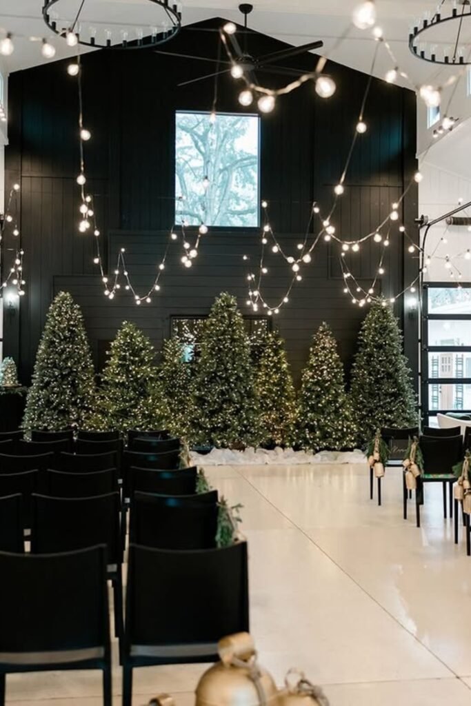 Evergreen trees soften the space naturally, proving modern design can still feel seasonal and emotionally grounded for couples and their guests.