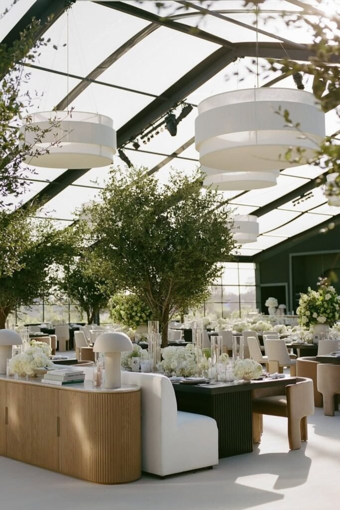 For couples who love clean design, modern weddings shine when furniture feels intentional, low-profile, and mixed with organic greenery elements throughout.
