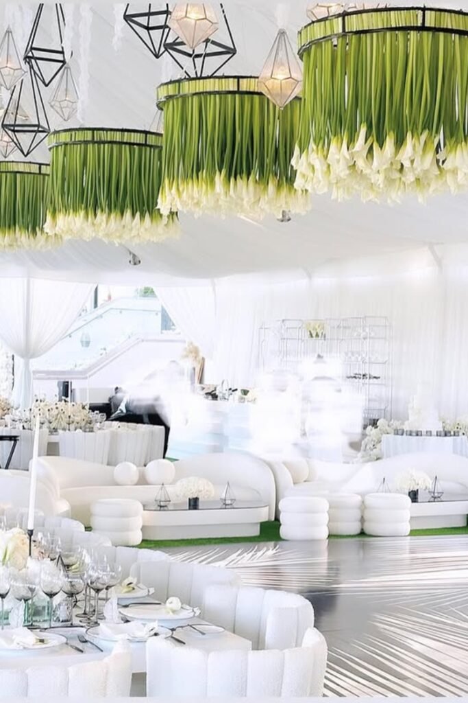 Hanging greenery and chandeliers draw eyes upward, creating softness overhead while keeping tabletops functional.