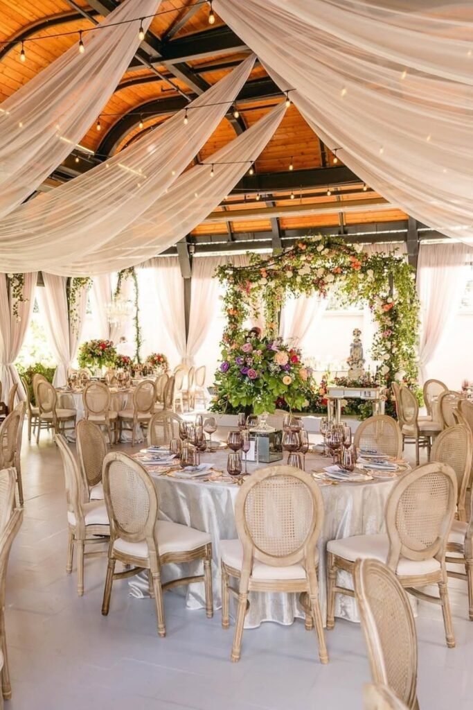 Draped fabric and hanging greenery soften rustic spaces, helping barn venues feel intentional rather than overly casual or busy for guests.