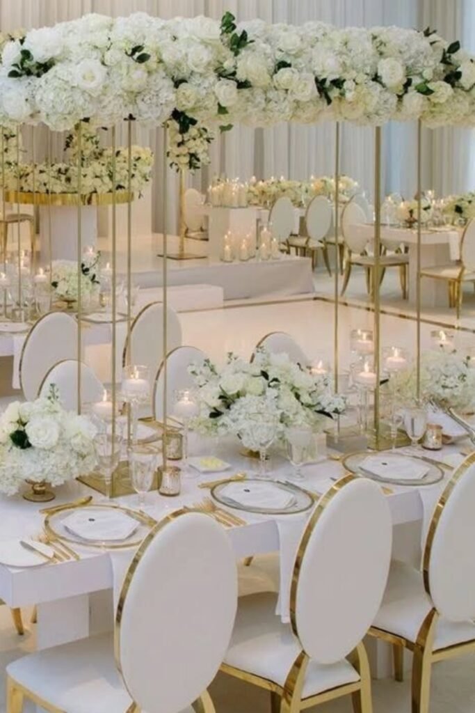 If you fear modern weddings feel cold, overhead florals add warmth without cluttering tables or overwhelming the design.