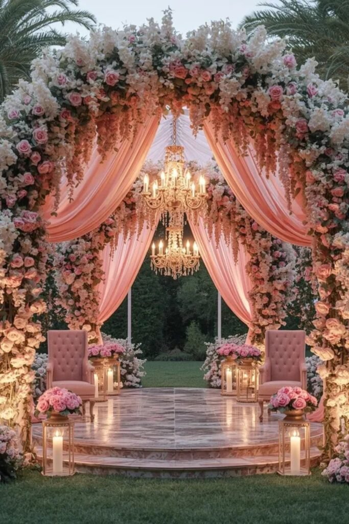 Start the ceremony with softness by using blush draping and layered florals, so modern structure still feels romantic and emotionally inviting.