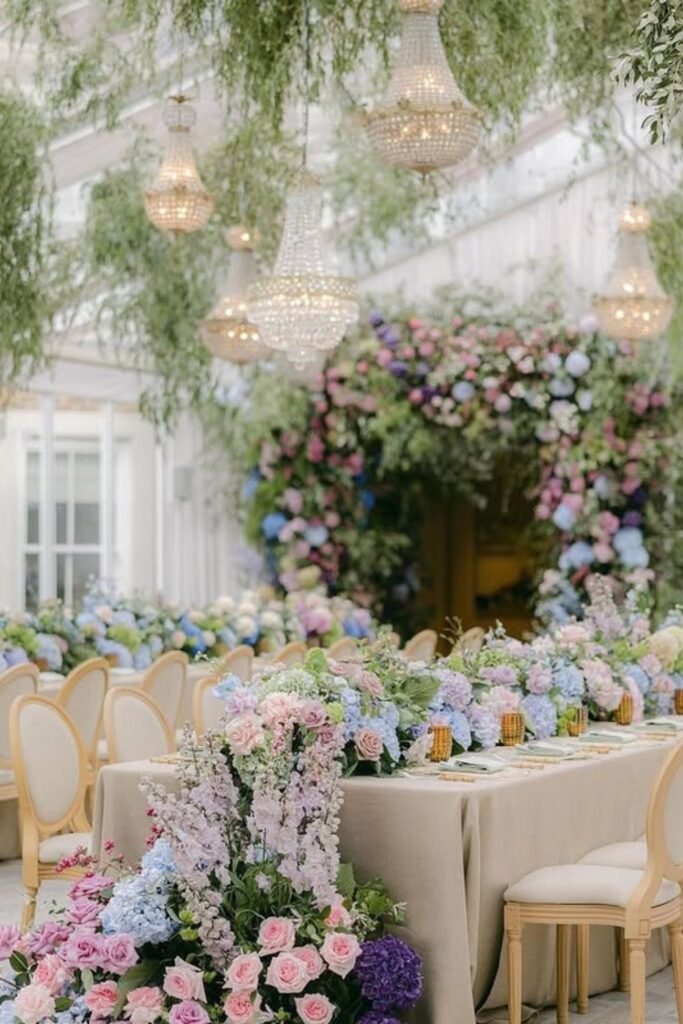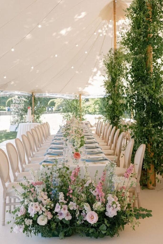 If you love garden romance but want modern control, keep tables clean and let florals flow naturally from the center of tables.