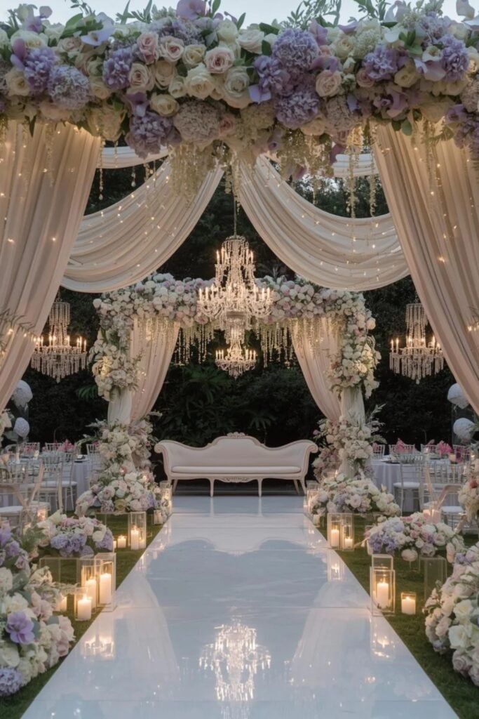 Start with a dramatic ceremony aisle when you want modern romance, using layered draping, soft lighting, and restrained florals instead of traditional arches.