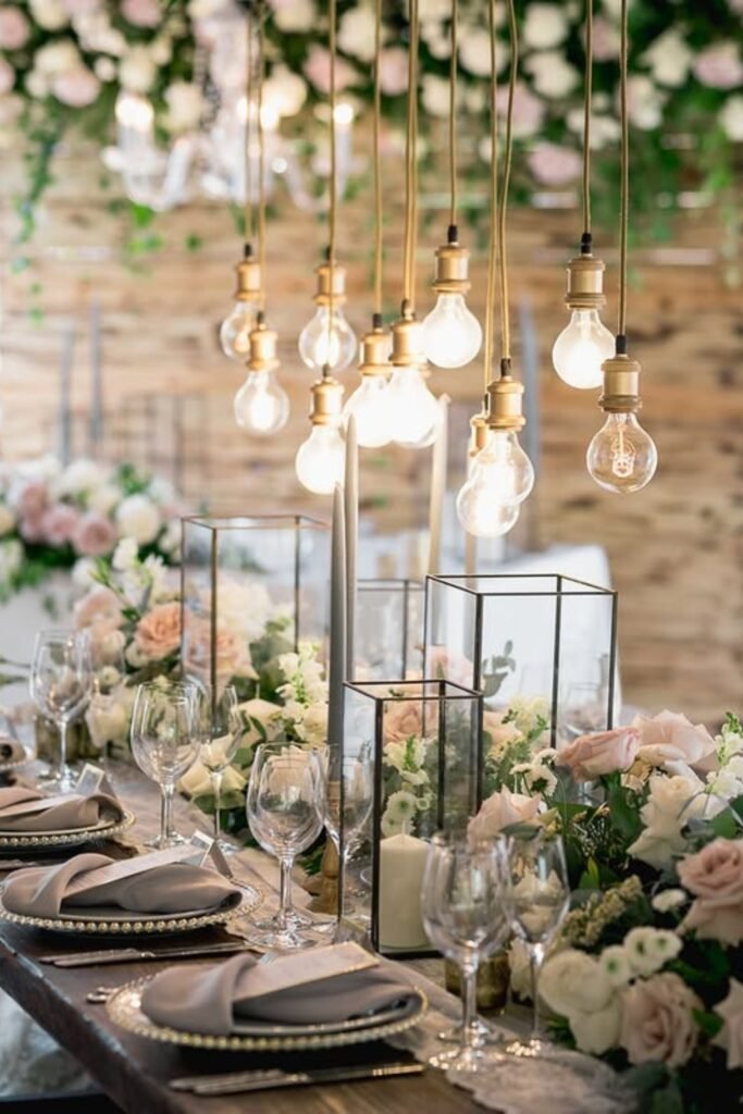 Exposed bulbs feel contemporary, while varied heights create rhythm that keeps the table setting intimate instead of flat for seated guests.