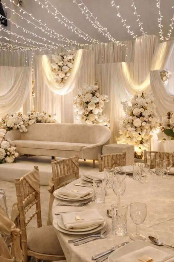 Layered fabric paired with warm string lighting replaces heavy décor, letting emotion come from atmosphere rather than excess styling choices alone.