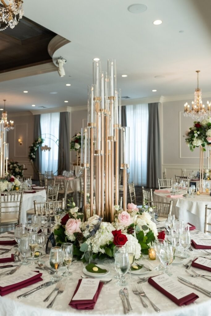 Metallic candleholders reflect light upward, preventing deep tones from feeling flat while enhancing evening ambiance beautifully for formal weddings.