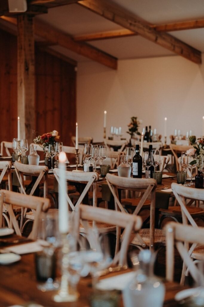 This wedding setup uses mulberry subtly, letting wood beams, neutral tones, and simple florals lead the atmosphere throughout the reception space.