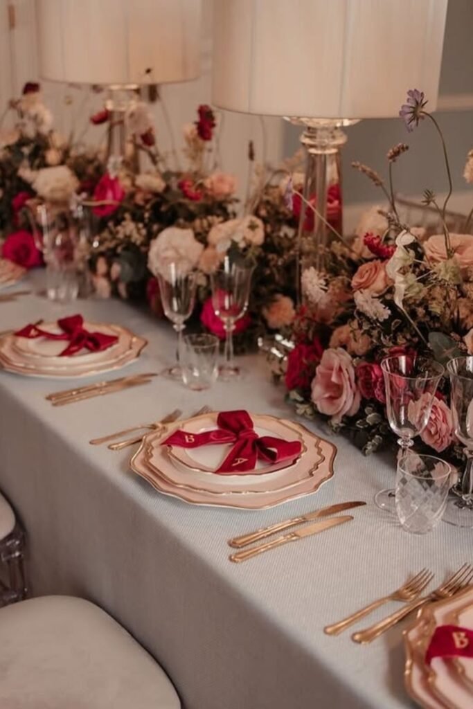 The color reads romantic rather than bold because it’s paired with gentle lighting and elegant tableware instead of dark surfaces.
