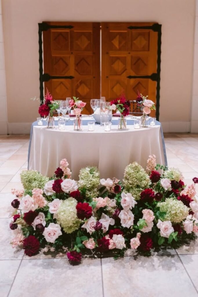 The creamy white base softens the color intensity while fresh roses repeat tones already used throughout the décor.