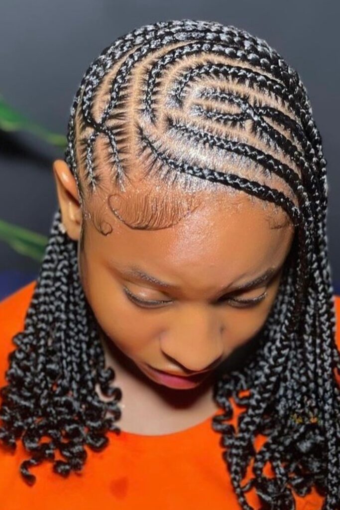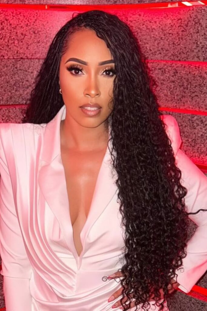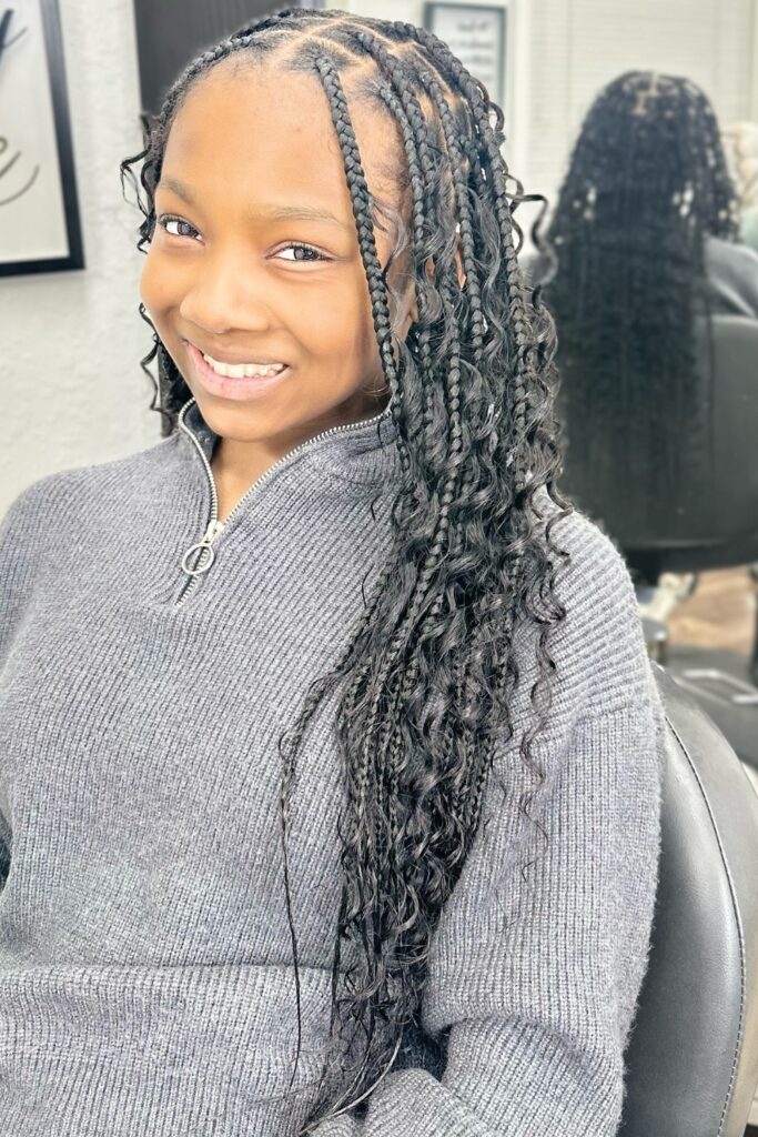 The combination of tight braids on the scalp and loose, bouncy curls at the ends creates a dynamic and youthful look that is both stylish and fun.