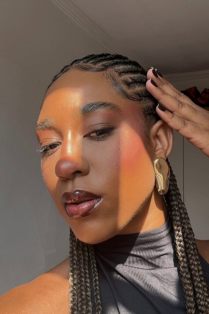 The final hairstyle in this series, Sleek and Braided, showcases sleekly cornrowed hair leading into long, detailed braids.