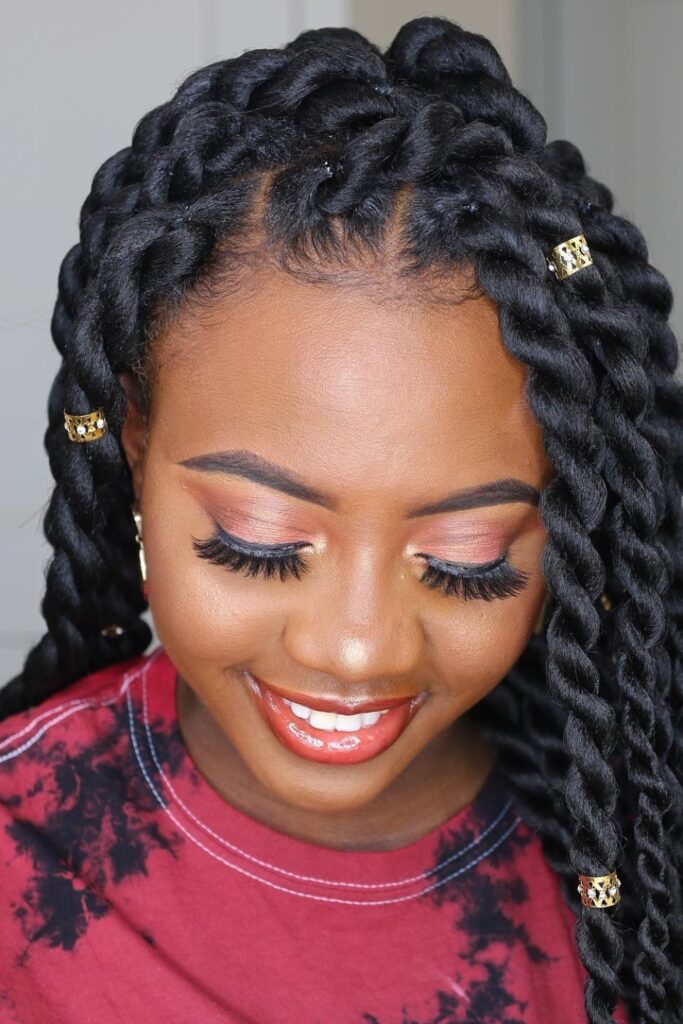The ninth hairstyle displays Chunky Twists adorned with chic hair accessories, adding a sparkle of glamour.