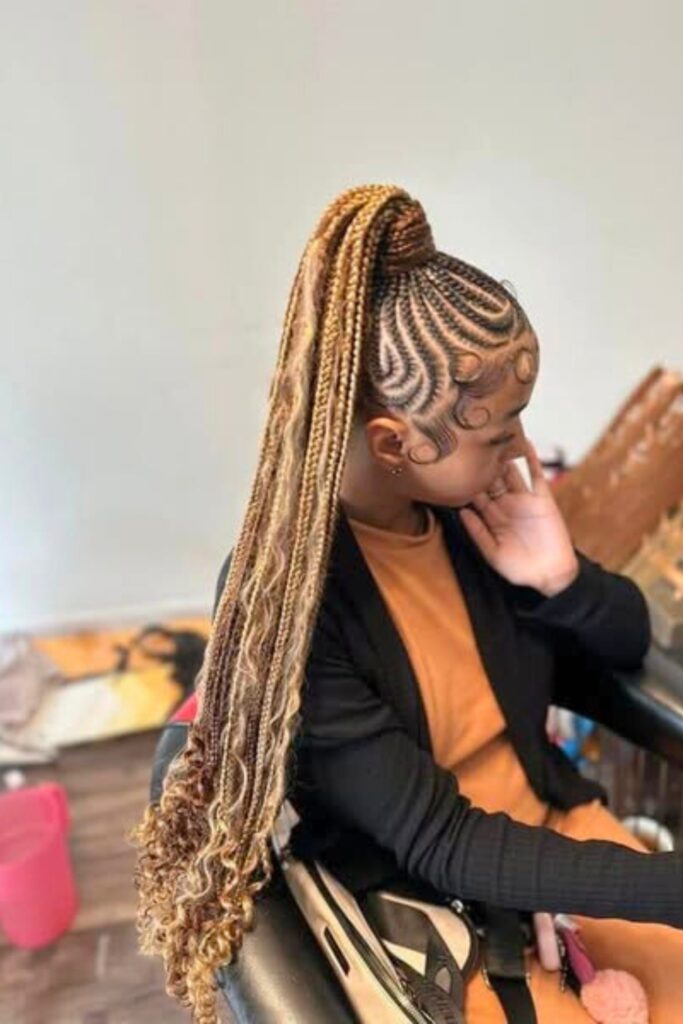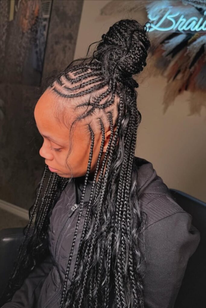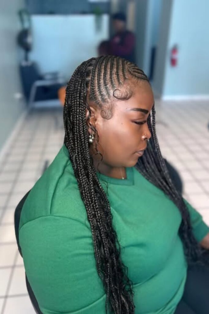 Sleek Tribal Braids combine precise cornrow patterns with long, flowing braids, creating a look that’s both traditional and modern.