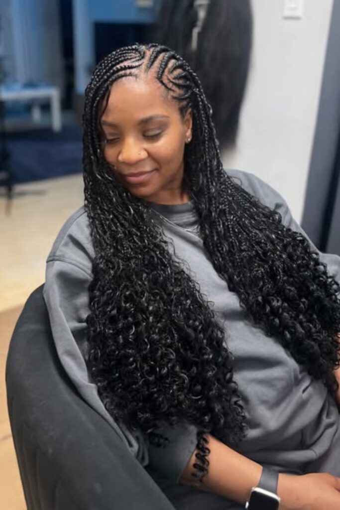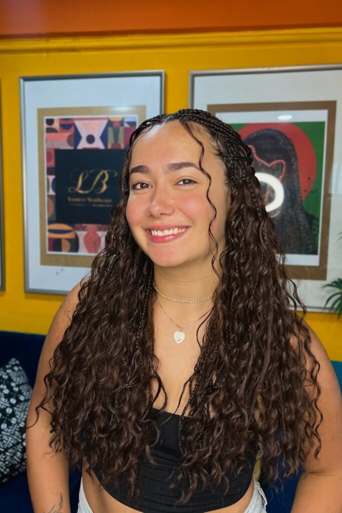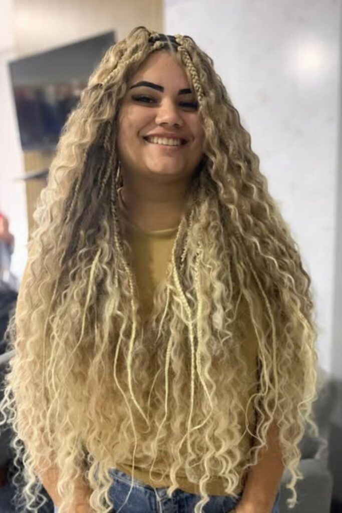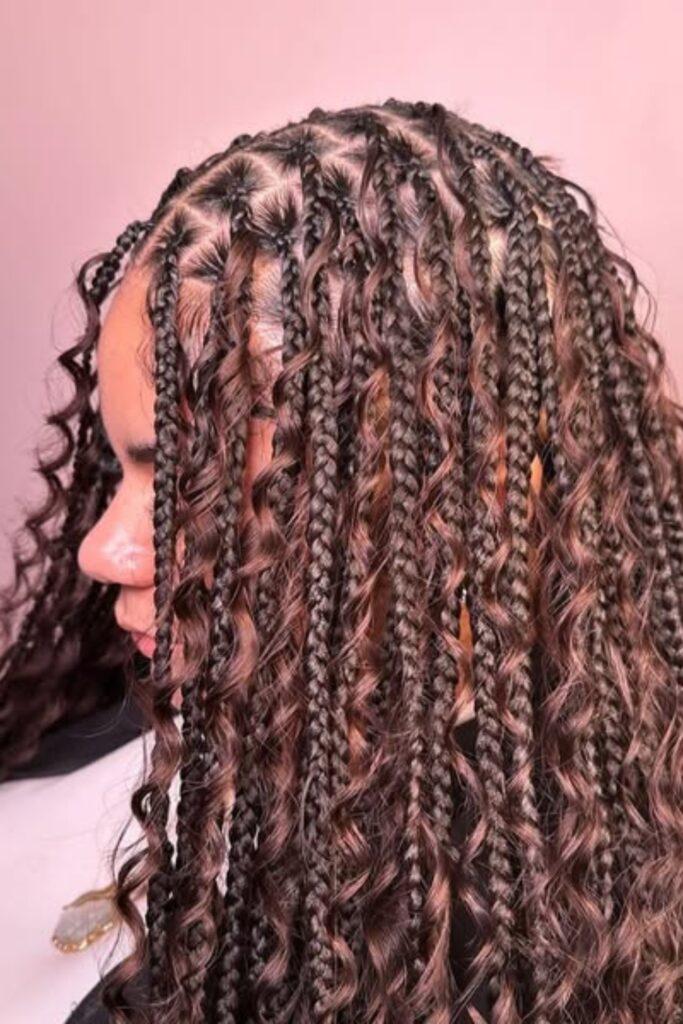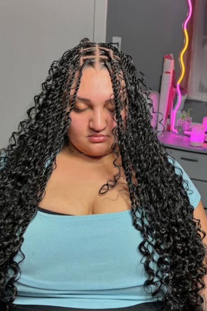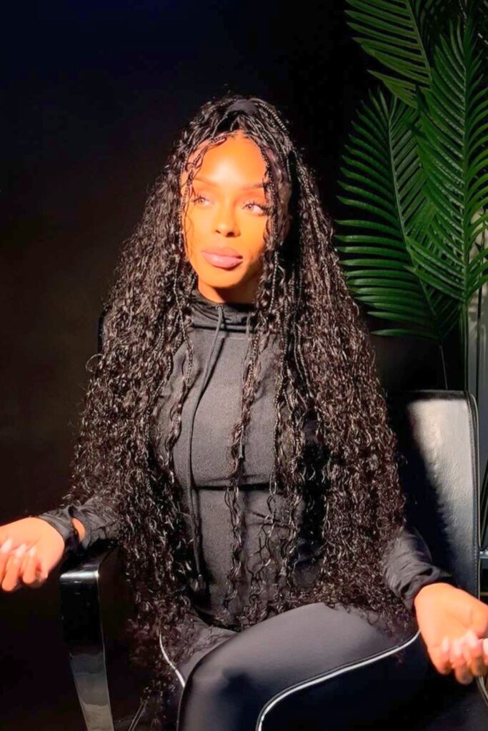 Voluminous Curly Braids combine intricate braiding at the scalp with free-flowing curls, providing a gorgeous blend of texture and movement.