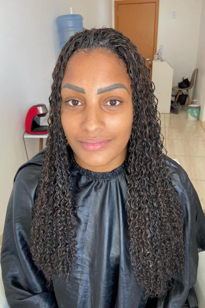 Chic Wet Curls feature small, tight braids that transition into moist-looking curls, giving off a fresh and trendy vibe.