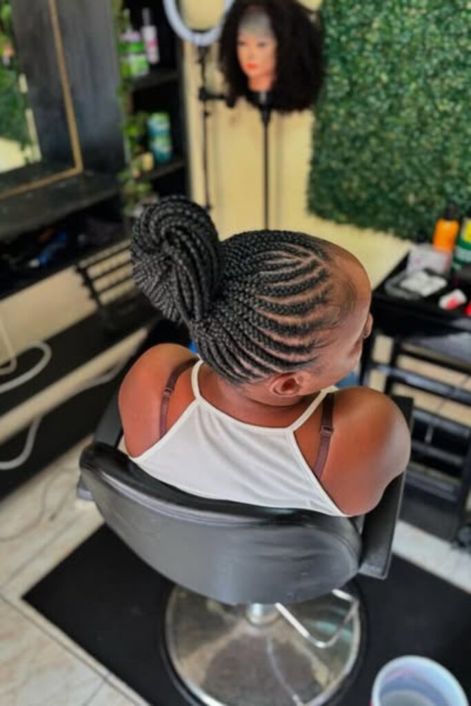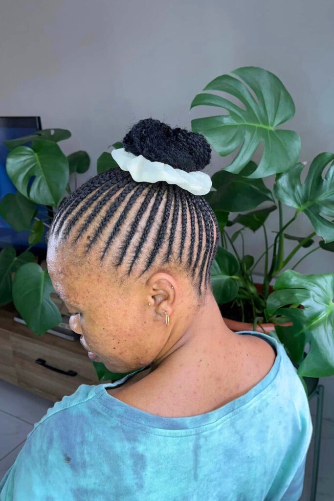 Sleek Cornrow Bun showcases meticulously braided cornrows that converge into a neat, high bun adorned with a stylish accessory.