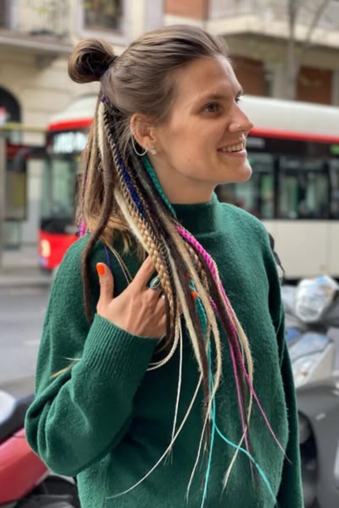 This hairstyle is perfect for individuals looking to add a pop of color and whimsy to their style, making it a standout choice for creative expressions.