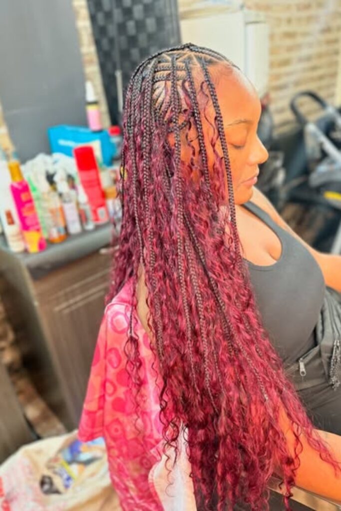 Curly Wine Braids feature vibrant, wine-colored braids curled at the ends for a playful and chic look.