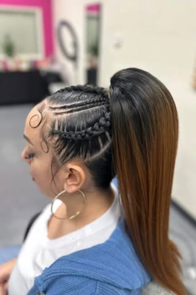 The Braided Ponytail Edge mixes tight cornrows on the scalp with a sleek, straight ponytail.