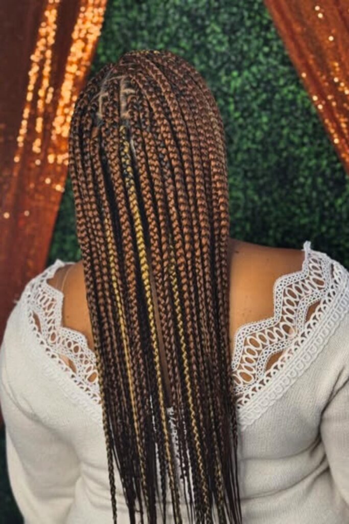 Striking Color Blend features long, sleek braids with a bold contrast of colors, adding an element of surprise and modernity to the traditional braid.