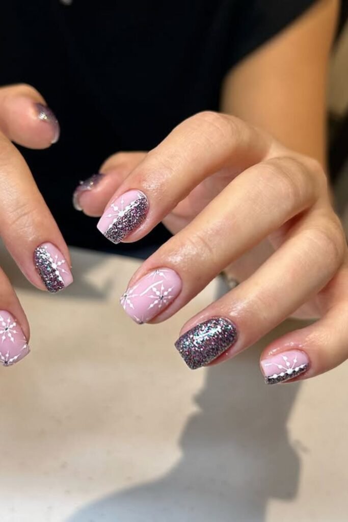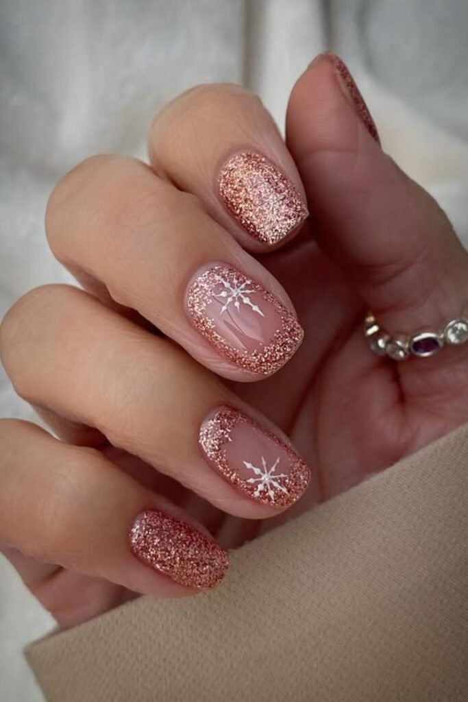 To get the look again, use a sheer nude base, fine rose-gold glitter to frame the nails, and paint small snowflakes on one or two accent nails.