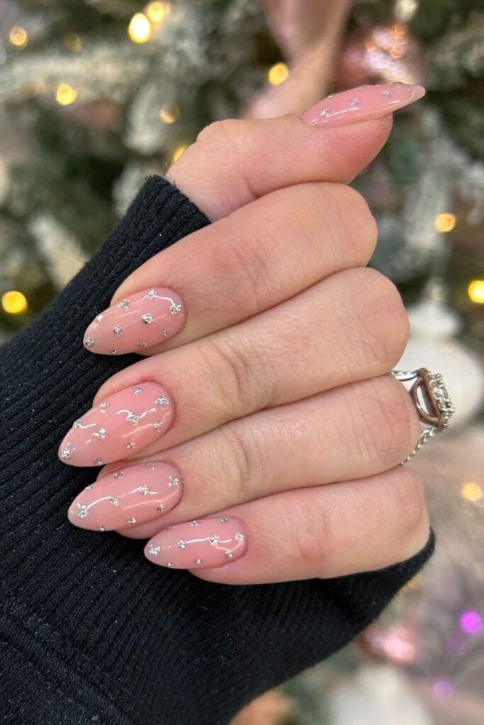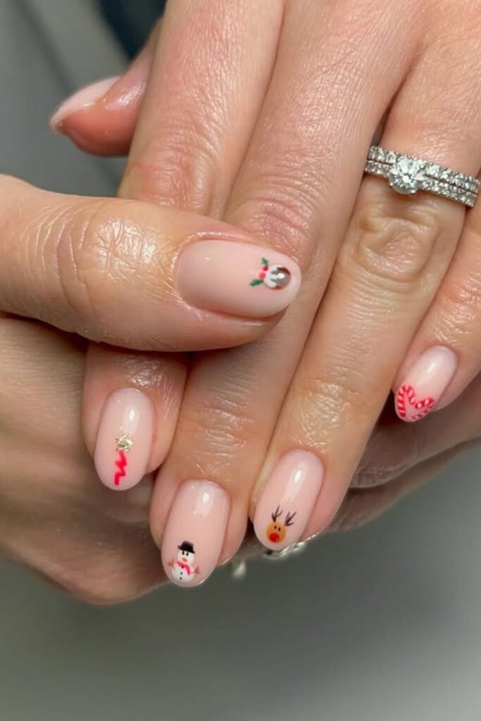 Tiny holiday icons across a nude base bring a playful touch without crowding the nails, making the design easy to wear for New Year gatherings.
