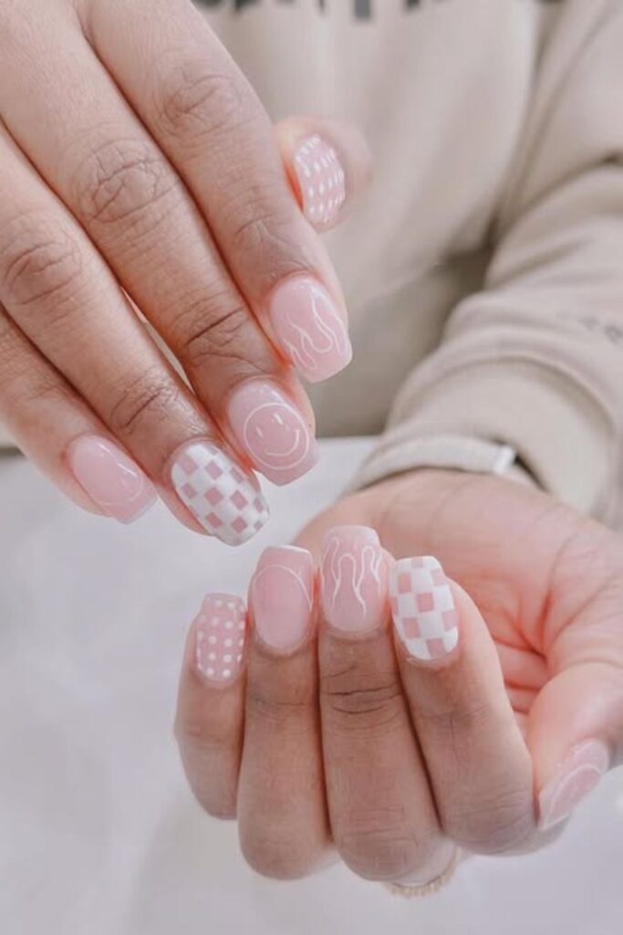 Every nail brings a different detail checkerboard, dots, waves, and a smile yet the soft pink base keeps things calm and wearable for New Year’s.