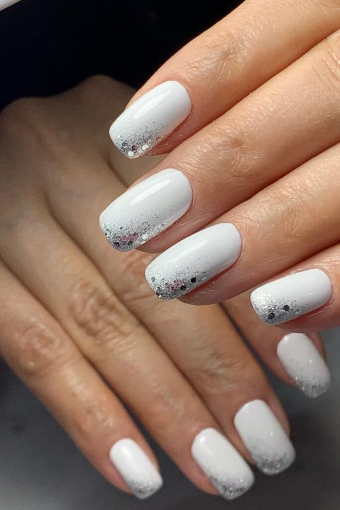 A bright white polish with a subtle glitter fade gives you a clean, winter-fresh look that is excellent for New Year’s Eve.