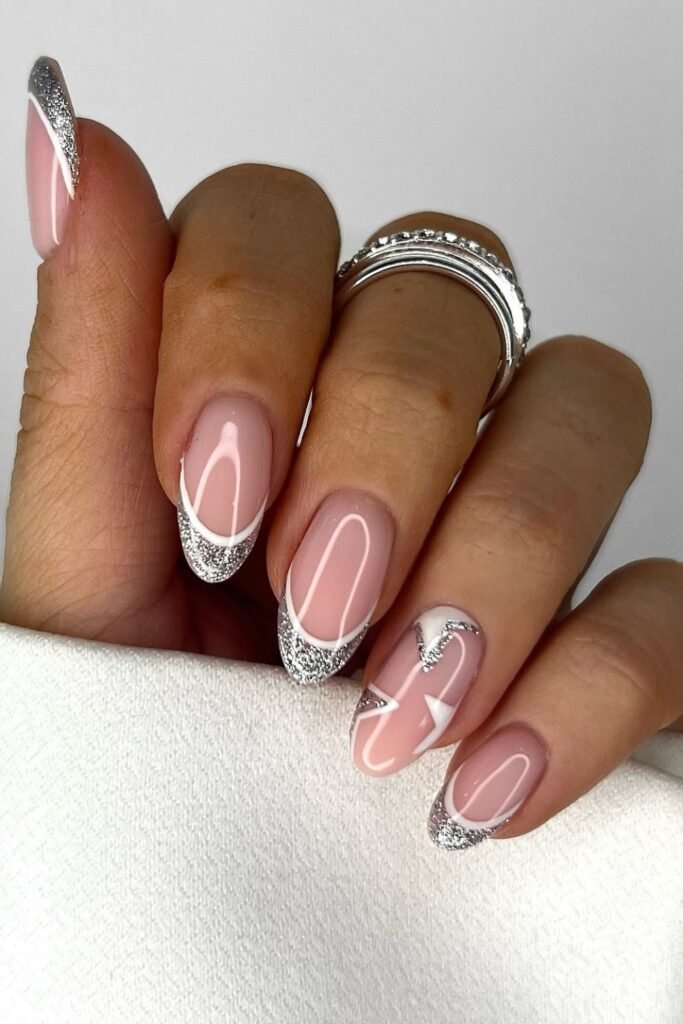 To make it again, paint a sheer pink base, draw delicate white curves on the nail, then press fine silver glitter along the tips.