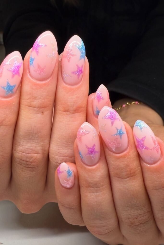 Bright, sparkly stars in pink and blue instantly bring a fun, party-ready mood to your nails perfect when you want something playful for New Year’s without going heavy on dark shades.