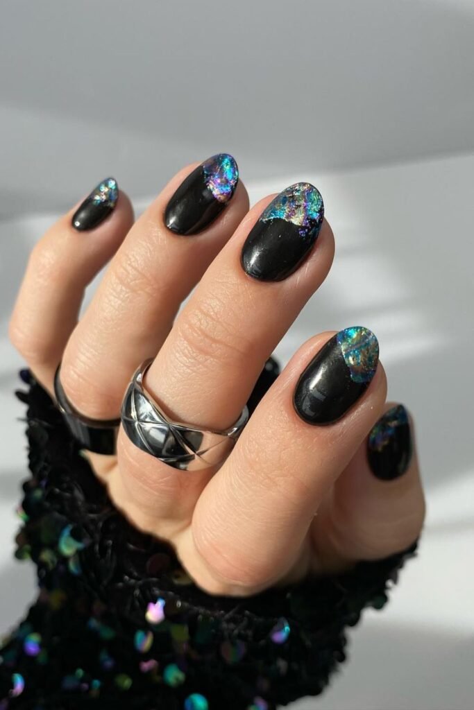 Black lacquer and broken iridescent foils make your nails look like a vivid night sky, which is excellent for New Year’s festivities.