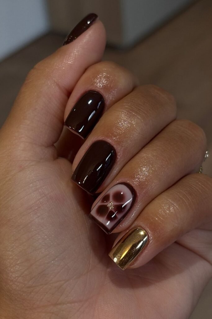 Deep mocha gloss and gold chrome accent make a rich, modern blend that works well for New Year’s Eve when you want something striking but not too sparkly.