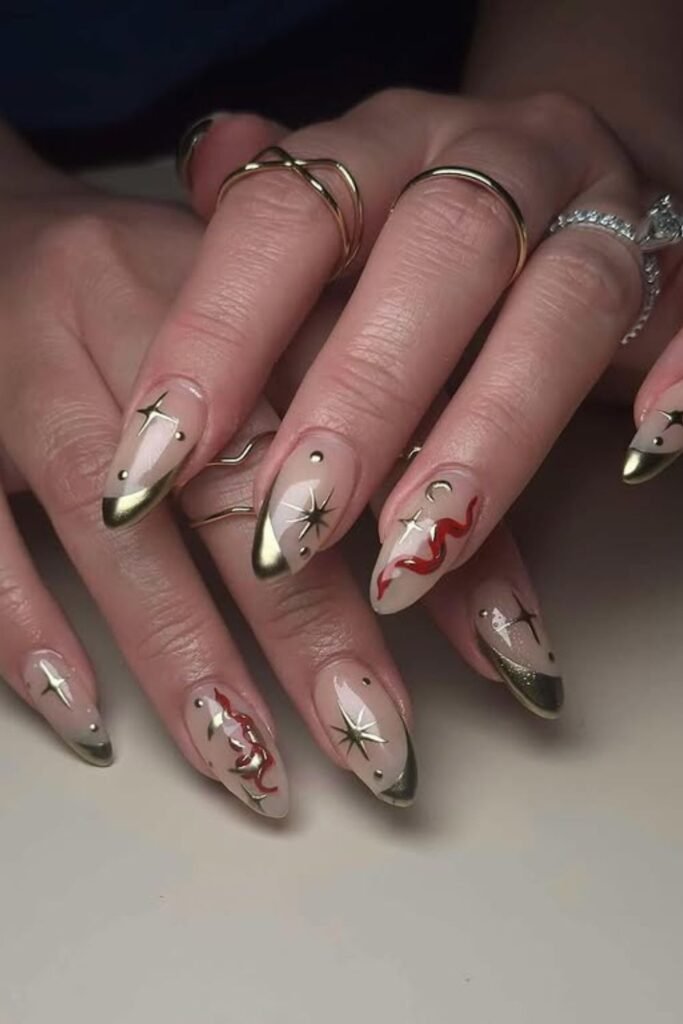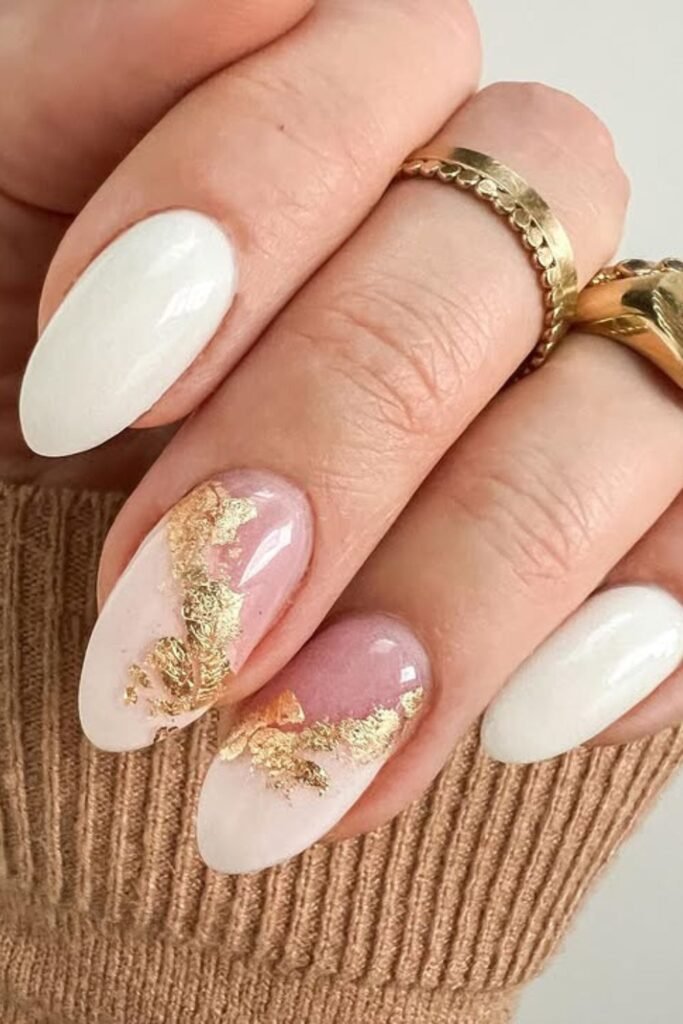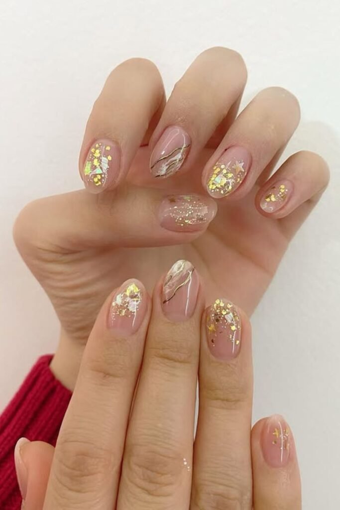Soft nude nails instantly feel festive when you scatter gold foil across the surface, and the marble accents add a clean touch without making the design heavy.