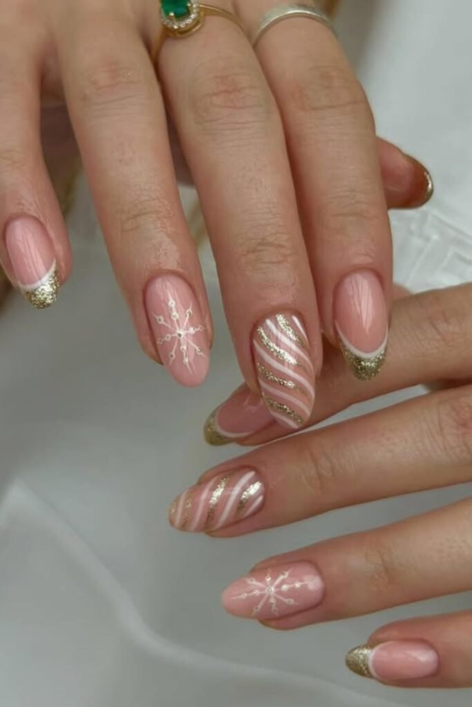 To do it again, start with a blush base, outline the tips with metallic gold, then add thin swirl lines or small dot-based snowflakes to change things up.