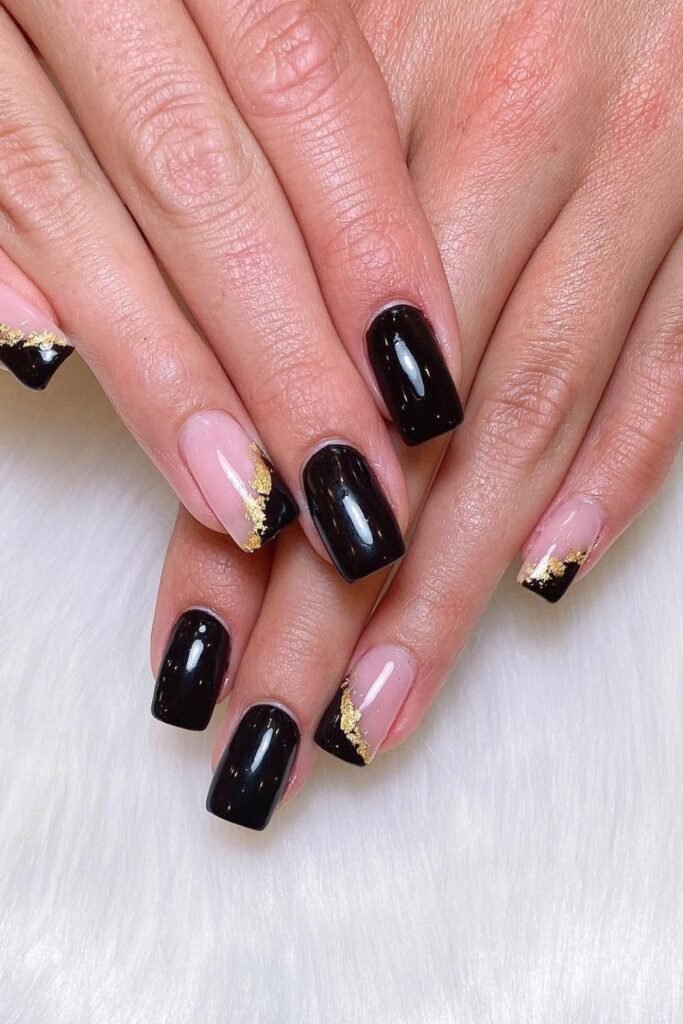 Bold black nails paired to soft nude bases and gold foil create a rich, evening-ready vibe perfect for parties or festive nights out.