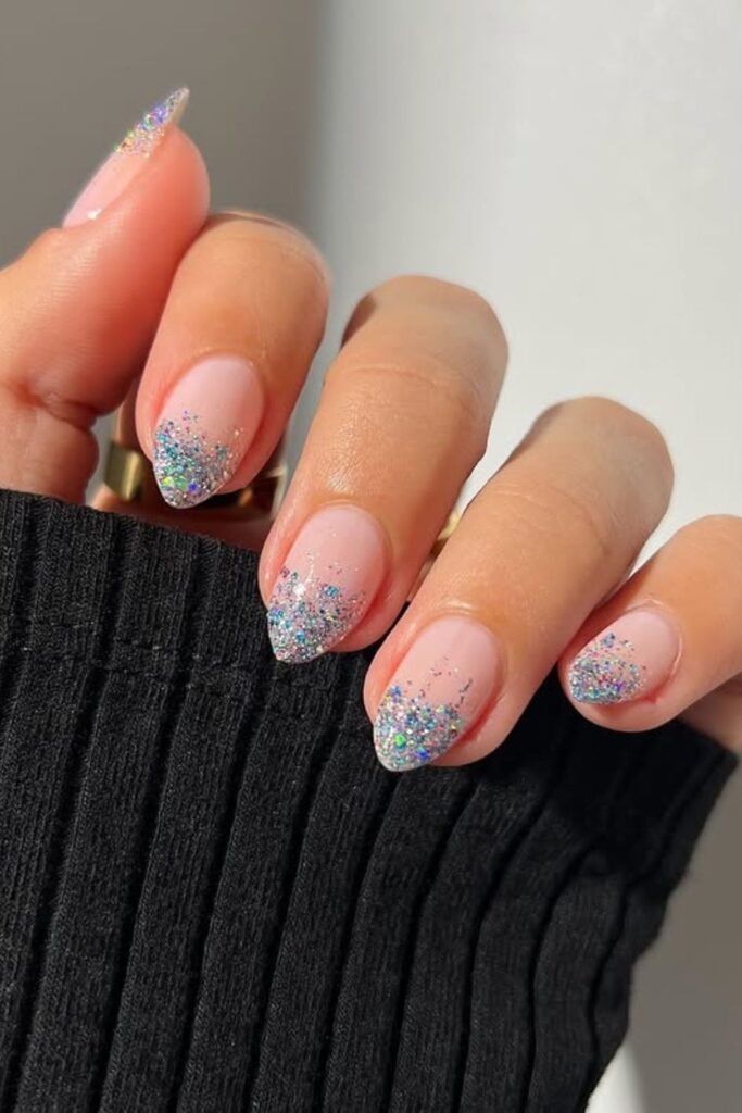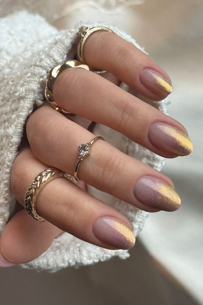 Rose-gold glitter wrapped around each nail brings a warm, festive glow that fits beautifully for New Year’s nights.