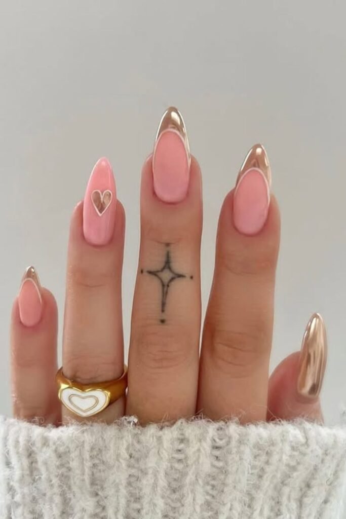Pink almond nails get a glam upgrade once those molten-gold tips catch the light. This pattern is great for parties, romantic evenings.