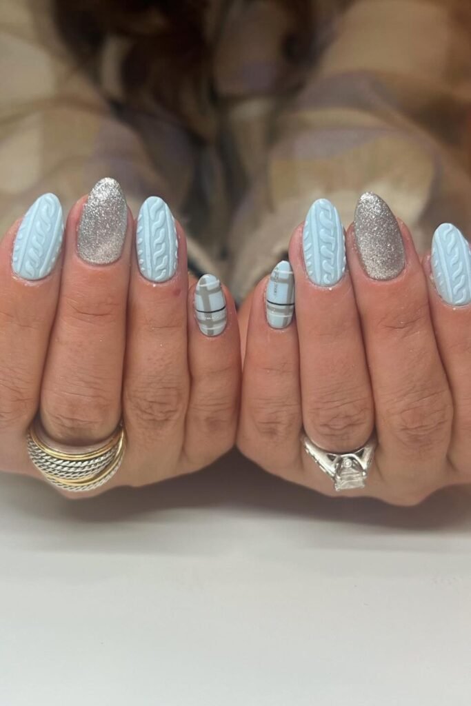 Soft blue nails instantly feel seasonal once you blend cable-knit texture, silver sparkle, and a clean plaid accent.