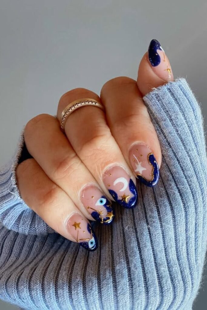 Deep navy edges create a moody frame here, letting the tiny moons, stars, and evil-eye accents feel almost like a night sky on your nails.